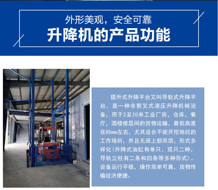济南航天升降机械有限公司是以生产液压升降货梯、导轨式升降机、移动式登车桥、固定式登车桥、液压电梯、别墅电梯、家用电梯、载货电梯、升降平台等为主导产品的生产企业。 公司占地7000平方米,拥有现代化标准厂房5000平方米,引进整套电梯加 工专用设备,加工精度高,自动化程度高,生产效力高,年可生产各类货梯 ,家用电梯等2000 台° 公司现有生产技术工人100人,中高级技术人员、企业管理人员三十多人, 安装维保技术工人50多人,全国各大中城市设有销售网点,专业营销员20多人, 承接各类家用电梯的生产加工安装业务。 航天不仅是液压升降货梯、家用电梯有限公司不仅引进了一流的设备制造商,质量把控方面 更是严格执行国际标准,通过IS019001-2015国际标准质量体系认证,推行了现代 企业管理制度,市场营销、生产、工艺、技术、设备、安装管理、售后服务等方面, 建立了各种行之有效的管理制度。郑重地承诺:家用电梯启用一年内免费三包,任 何故障公司将指派遍布全国的安装维修网点员工及时排除,让用户无后顾之忧。 公司自创建以来,始终传承着“以技术回报社会”的创新理念,本着质量第一、 科学管理、信守合同、用户至上的宗旨,一如既往地提供优质的电梯产品和优良的 售后服务。我们将不断进取,融合现代科技,创民族品牌,并与国内外同行和家用 电梯用户携手共进,共同促进中国家用电梯业的发展。