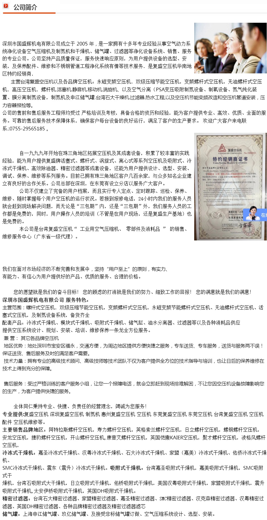主营复盛空压机、无油空压机制氮机和干燥机的销售、保养配件维修
